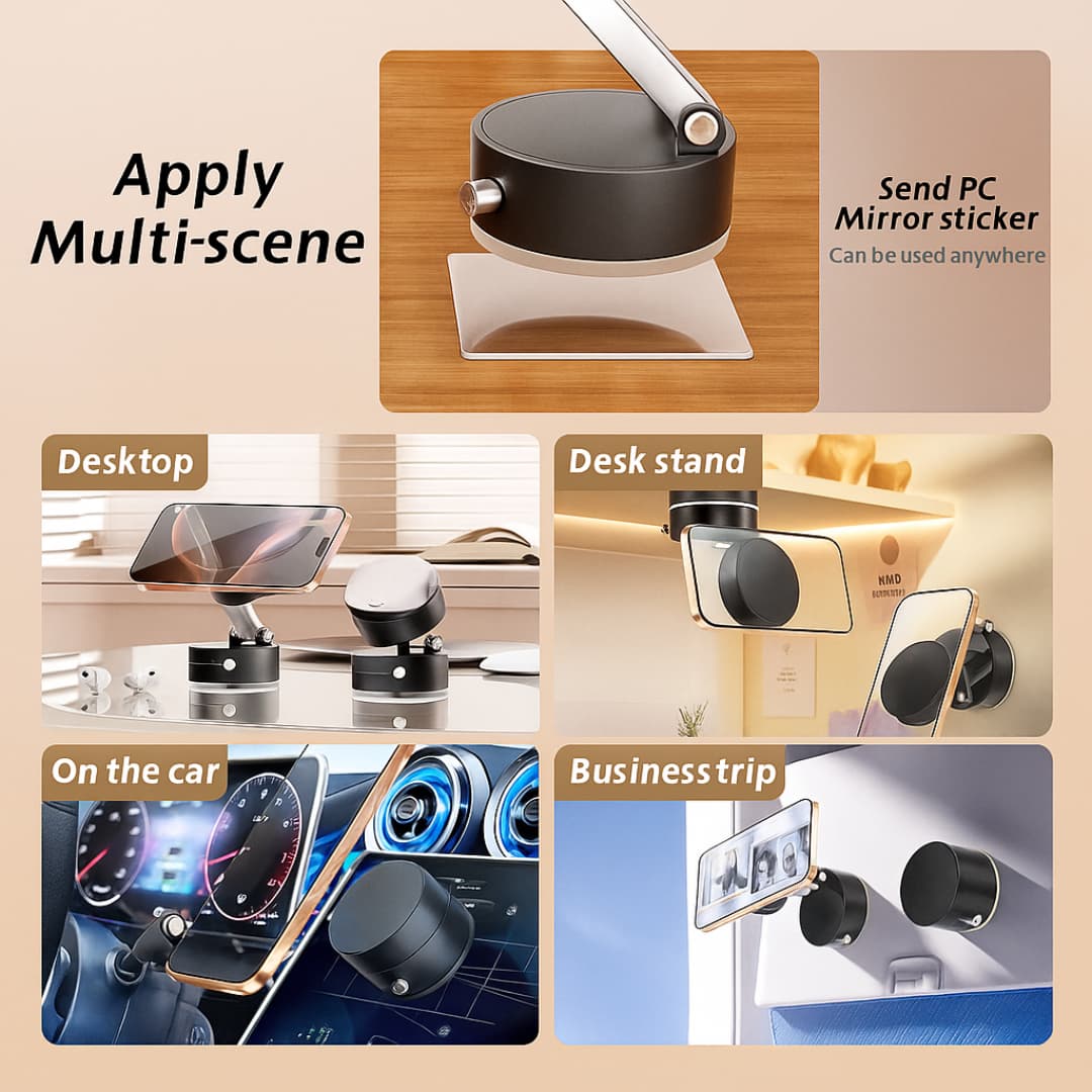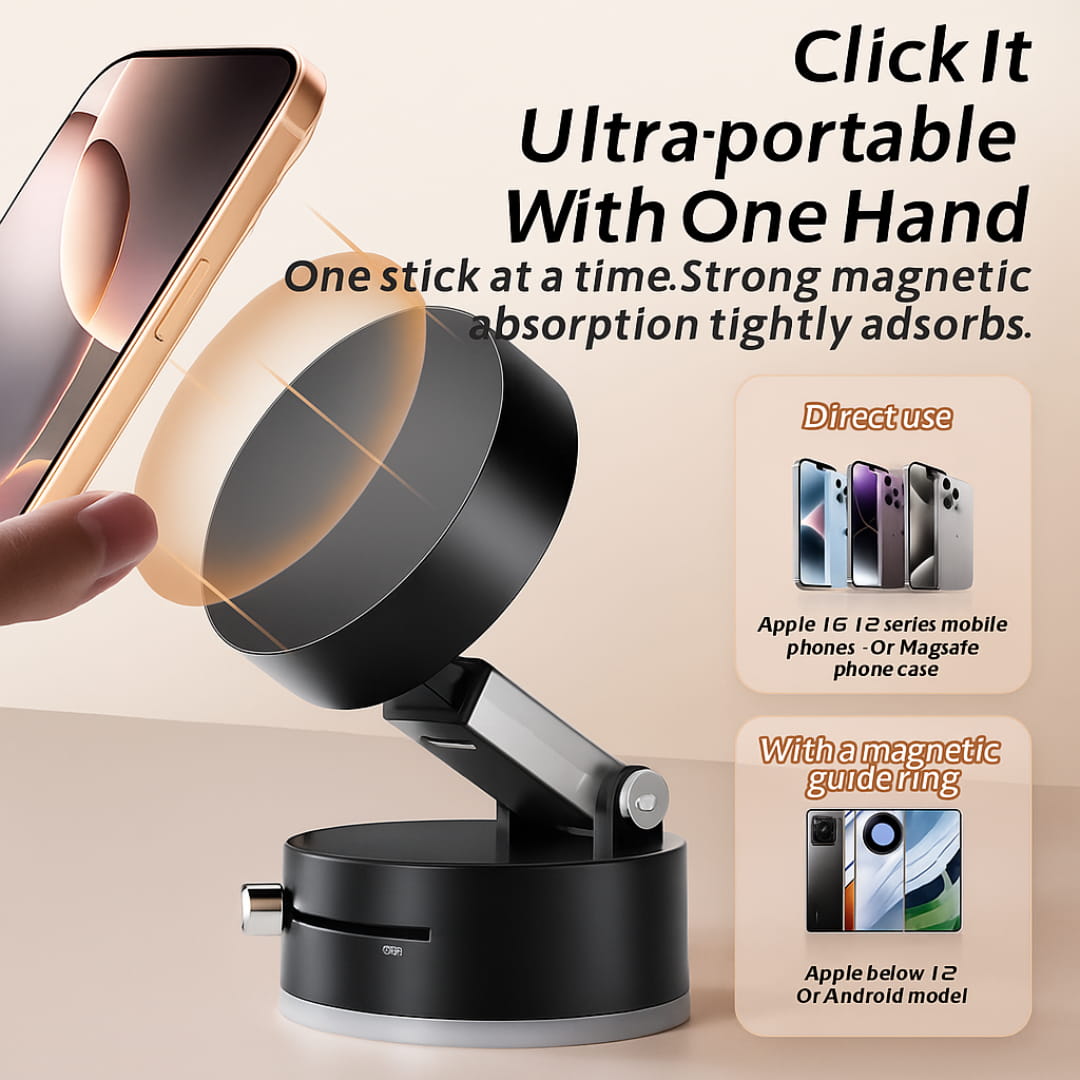 Keep your phone secure and always in view with this premium magnetic suction cup phone holder. Designed with powerful vacuum adsorption and a strong magnetic grip, it ensures your device stays firmly in place whether you’re driving, working at your desk, or relaxing at home.